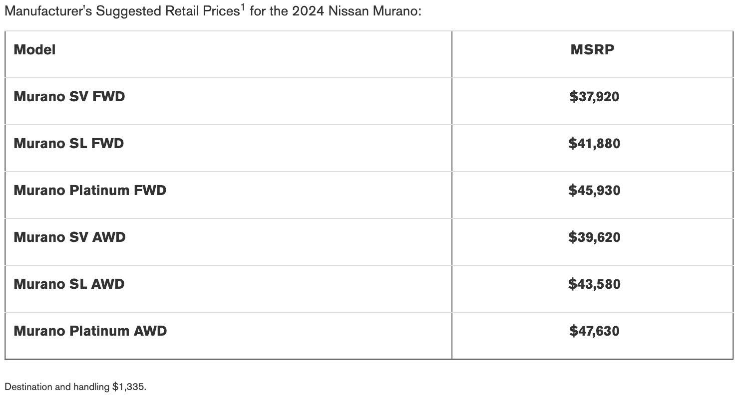 - AutoPacific's Premium Mid-Size XSUV Segmentation (excludes EVs). 2024 Nissan Murano vs. latest in-market competitors. Intelligent Forward Collision Warning cannot prevent collisions. See Owner's Manual for safety information. Based on manufacturers' websites.