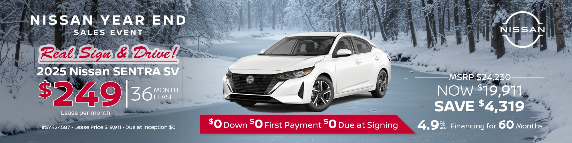 2025 Nissan Sentra. #SY424587 MSRP $24,230. Lease price $19,911. $249 per mo. plus tax 36 mo lease. 5,000 mi/yr. $0 due at inception. Lease and APR offers on approved credit for well qualified buyers. Offers expire 1/6/26.