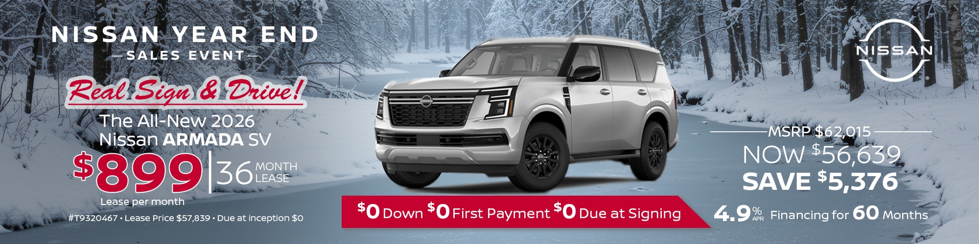 2026 Nissan Armada #T9320467. MSRP $62,015. Lease price $57,839. $899 per mo. plus tax. 36 mo lease. 5,000 mi/yr. $0 due at inception. Lease and APR offers on approved credit for well qualified buyers. Offers expire 1/5/26