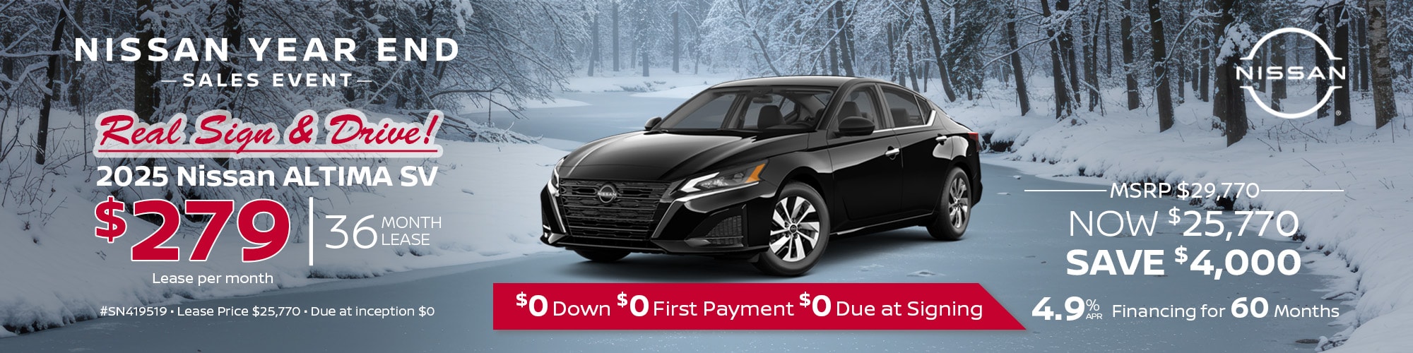 2025 Nissan Altima SV. #SN419519. MSRP $29,770. Lease price $25,770. $279 per mo. plus tax. 36 mo lease. 5,000 mi/yr. $0 due at inception. Lease and APR offers on approved credit for well qualified buyers. Offers expire 1/5/26.