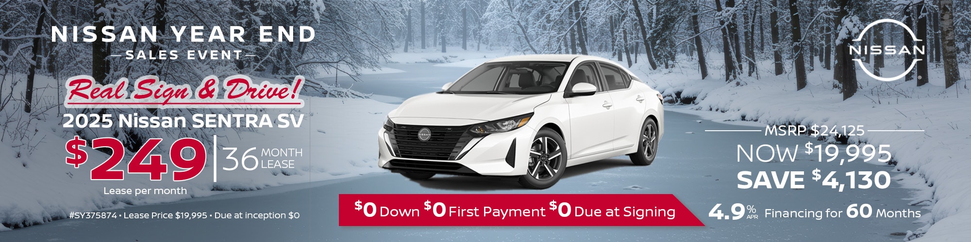 2025 Nissan Sentra. #SY375874 MSRP $24,125. Lease price $19,995. $249 per mo. 36 mo lease. 5,000 mi/yr. $0 due at inception. Lease and APR offers on approved credit for well qualified buyers. Offers expire 12/1/25.