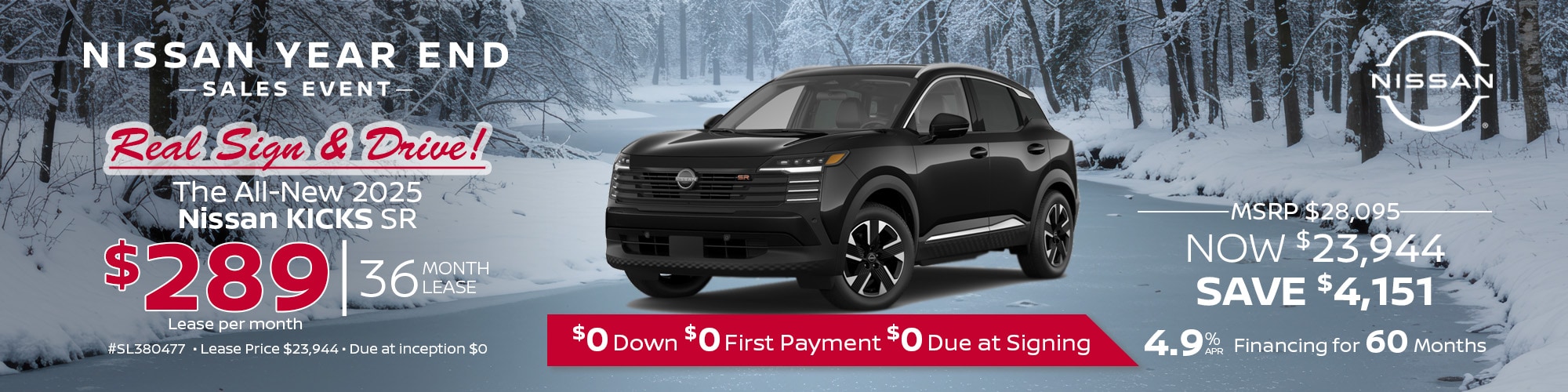 2025 Nissan KICKS SR. #SL380477. MSRP $28,095 Lease price $23,944. $289 per mo. plus tax. 36 mo lease. 5,000 mi/yr. $0 due at inception. Lease and APR offers on approved credit for well qualified buyers. Offers expire 1/5/26.