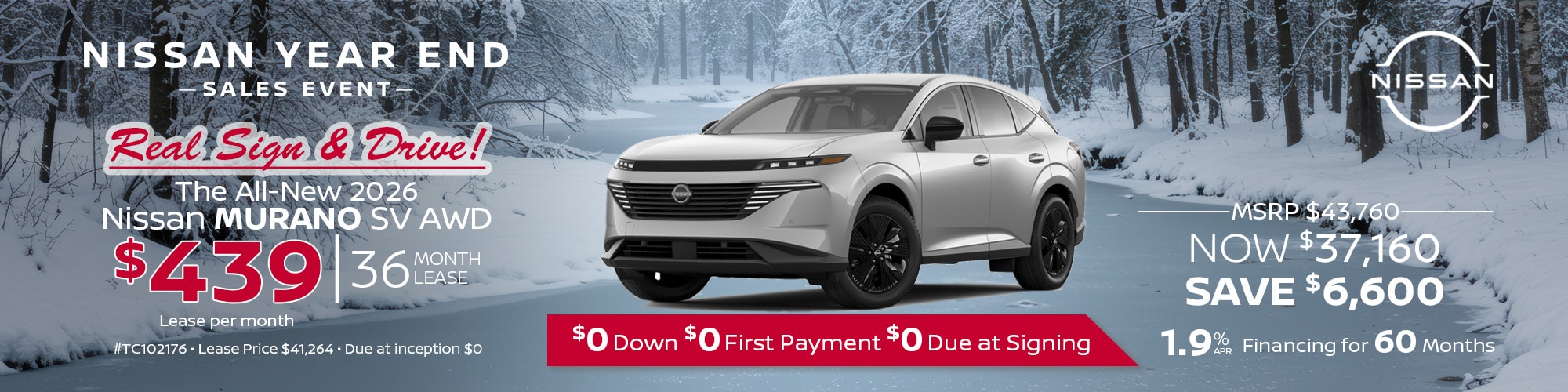 2026 Nissan Murano. #TC102176. MSRP $43,760. Lease price $41,264. $439 per mo. plus tax. 36 mo lease. 5,000 mi/yr. $0 due at inception. Lease and APR offers on approved credit for well qualified buyers. Offers expire 1/5/26.