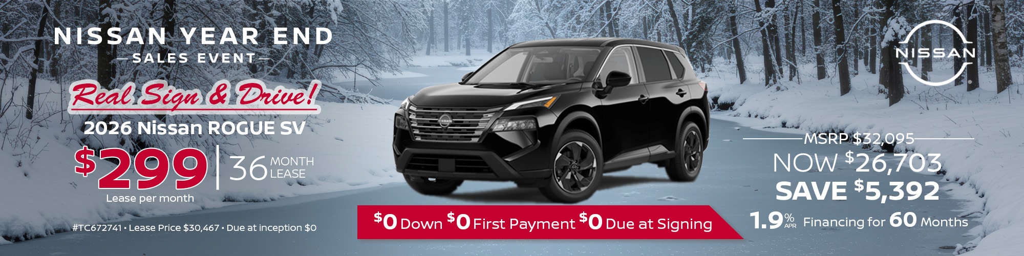 2026 Nissan Rogue. #TC672741. MSRP $32,095. Lease price $30,467 $299 per mo. plus tax. 36 mo lease. 5,000 mi/yr. $0 due at inception. Lease and APR offers on approved credit for well qualified buyers. Offers expire 1/5/26.