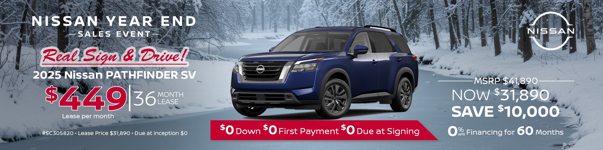 2025 Nissan Pathfinder #SC305820 MSRP $41,890. Lease price $31,890. $449 per mo. 36 mo lease. 5,000 mi/yr. $0 due at inception. Lease and APR offers on approved credit for well qualified buyers. Offers expire 12/1/25.