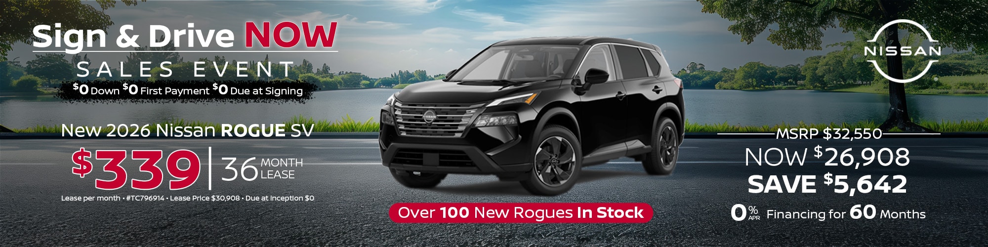 2026 Nissan Rogue. #TC796914. MSRP $32,550. Lease price $30,908. $339 per mo. plus tax. 39 mo lease. 5,000 mi/yr. $0 due at inception. Lease and APR offers on approved credit for well qualified buyers. Offers expire 4/30/26.