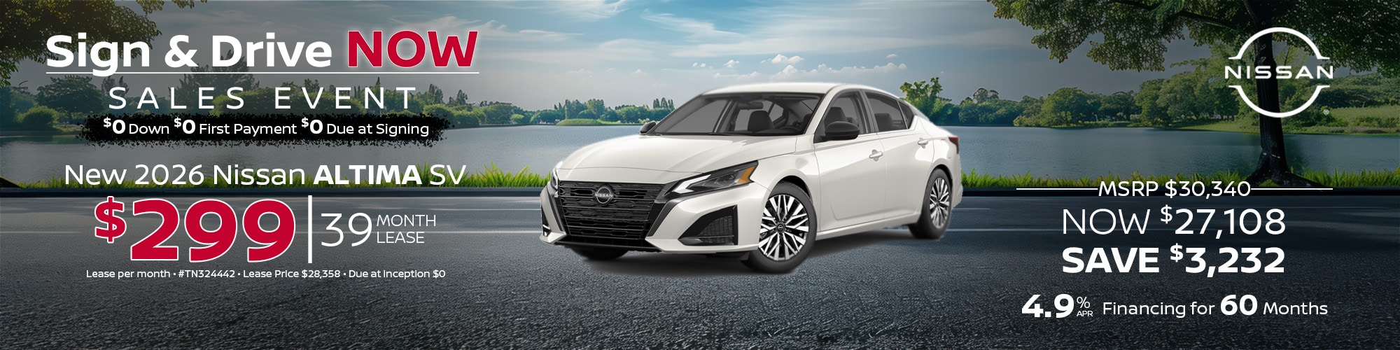 2026 Nissan Altima. #TN324442, MSRP $30,340. Sale price $28,358. $299 per month. 39 months. $0 due at inception. APR and lease offers on approved credit for well qualified buyers. Offers expire 4/30/26.