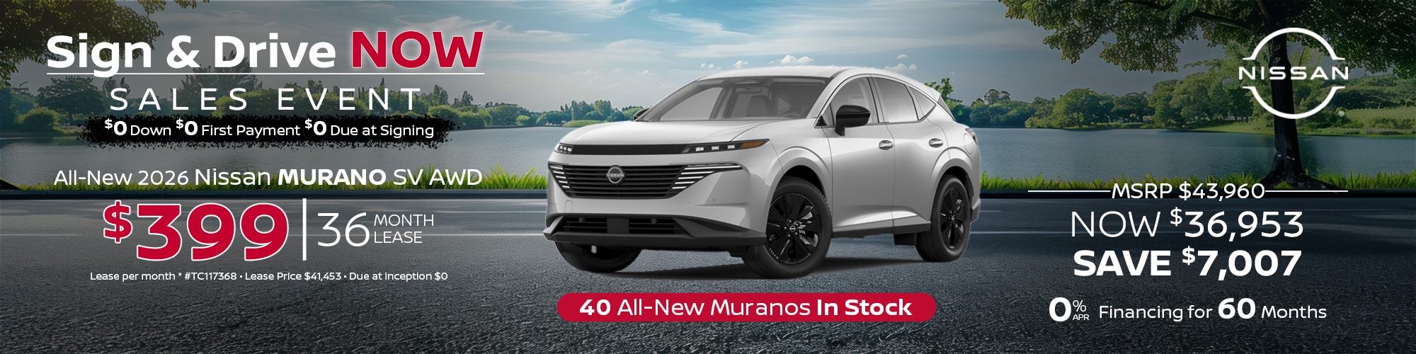 2026 Nissan Murano. #TC117368. MSRP $43,960. Lease price $41,453. $399 per mo. plus tax. 36 mo lease. 5,000 mi/yr. $0 due at inception. Lease and APR offers on approved credit for well qualified buyers. Offers expire 4/30/26.
