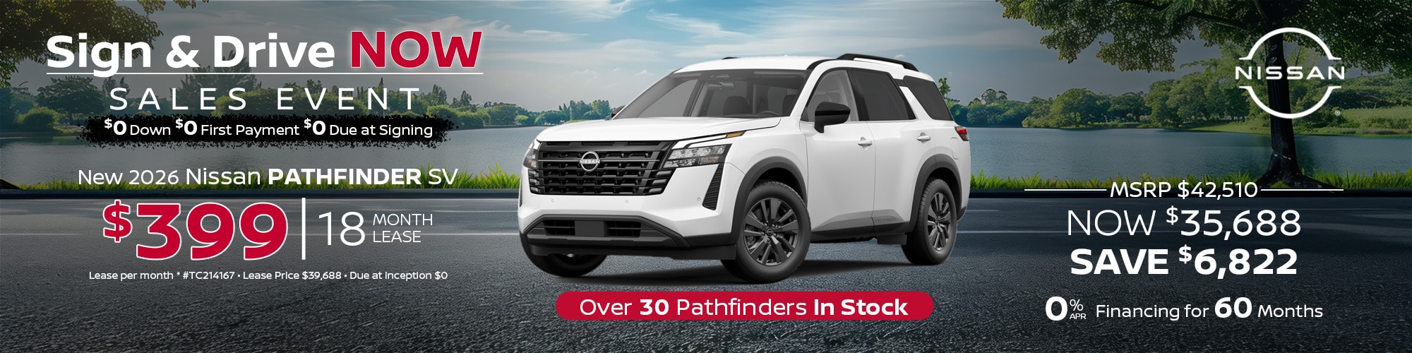 2026 Nissan Pathfinder #TC214167. Lease price $39,688. $449 per mo. plus tax. 18 mo lease. 10,000 mi/yr. $0 due at inception. Lease and APR offers on approved credit for well qualified buyers. Offers expire 4/30/26.