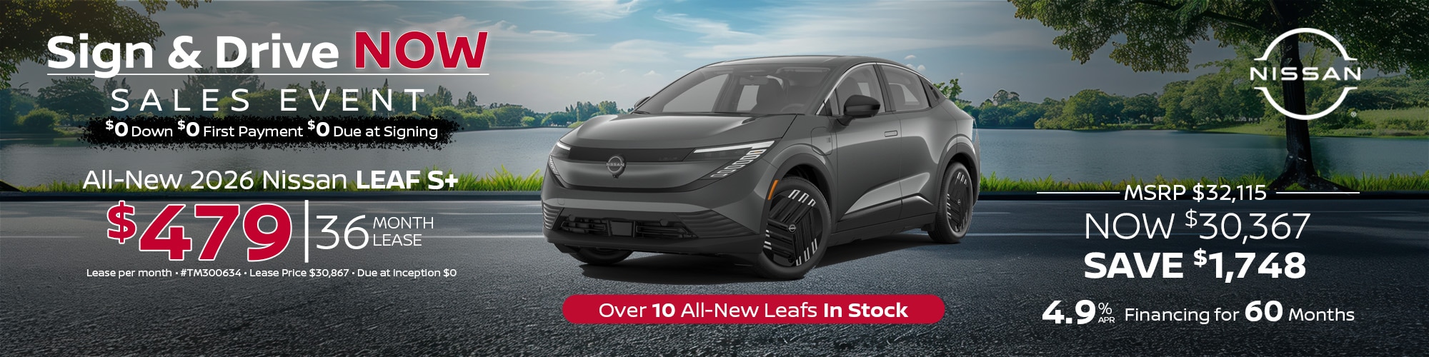 2026 Nissan LEAF. #TM300634. MSRP $32,115. Lease price $30,867 $479 per mo. plus tax. 36 mo lease. 5,000 mi/yr. $0 due at inception. Lease and APR offers on approved credit for well qualified buyers. Offers expire 4/30/26.