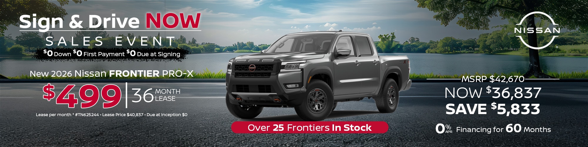 2026 Nissan Frontier #TN625244. MSRP. $42,670. Lease price $40,837. $499 per mo. plus tax. 36 mo lease. 5,000 mi/yr. $0 due at inception. Lease and APR offers on approved credit for well qualified buyers. Offers expire 4/30/26.
