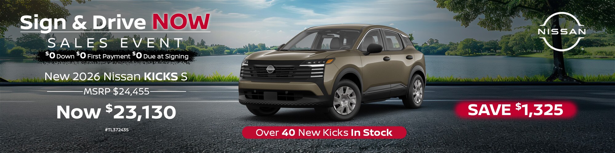 2026 Nissan Kicks #TL372435. MSRP $24,455. Lease price $23,130. Save $1325. Offers expire 4/30/26.