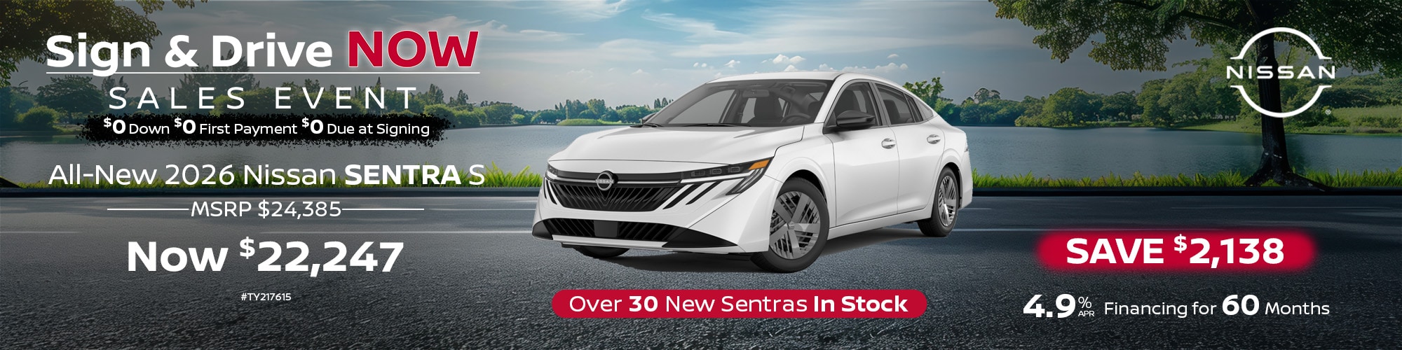 2026 Nissan Sentra. #TY217615, MSRP $24,385. Sale price $22,247. APR offers on approved credit for well qualified buyers. Offers expire 4/30/26.