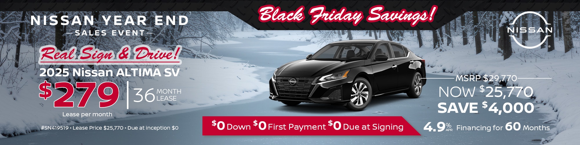 2025 Nissan Altima SV. #SN419519. MSRP $29,770. Lease price $25,770. $279 per mo. plus tax. 36 mo lease. 5,000 mi/yr. $0 due at inception. Lease and APR offers on approved credit for well qualified buyers. Offers expire 12/1/25.
