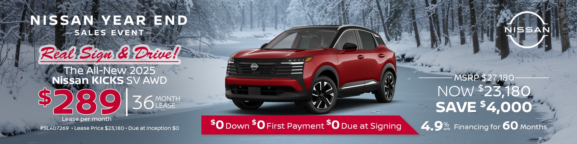 2025 Nissan KICKS. #SL407269. MSRP $27,180. Lease price $23,180. $289 per mo. 36 mo lease. 5,000 mi/yr. $0 due at inception. Lease and APR offers on approved credit for well qualified buyers. Offers expire 12/1/25.