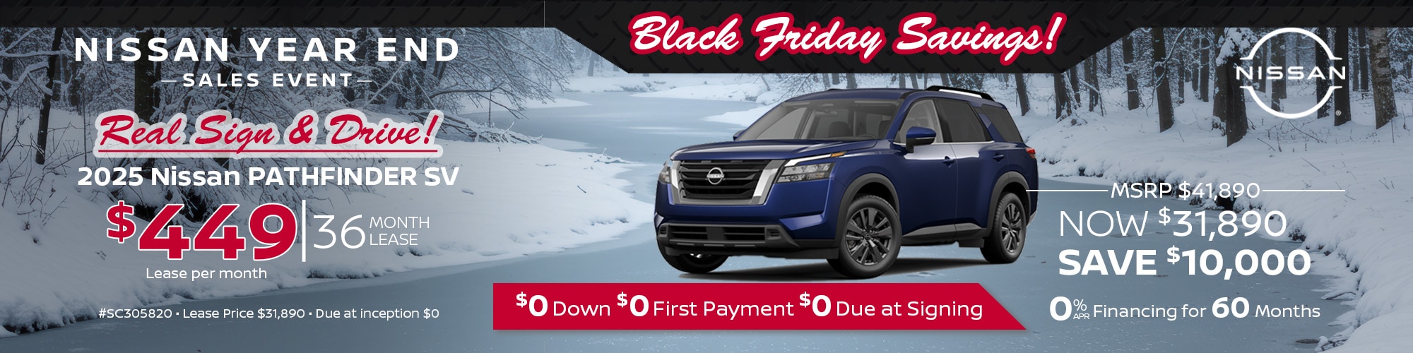 2025 Nissan Pathfinder #SC305820 MSRP $41,890. Lease price $31,890. $449 per mo. plus tax. 36 mo lease. 5,000 mi/yr. $0 due at inception. Lease and APR offers on approved credit for well qualified buyers. Offers expire 12/1/25.
