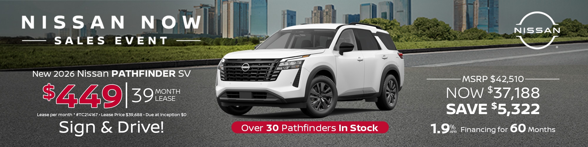 2026 Nissan Pathfinder. #TC214167 MSRP $42,510. Lease price $39,688. $489 per mo. plus tax. 39 mo lease. 5,000 mi/yr. $0 due at inception. Lease and APR offers on approved credit for well qualified buyers. Offers expire 3/31/26.